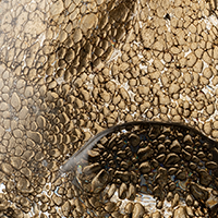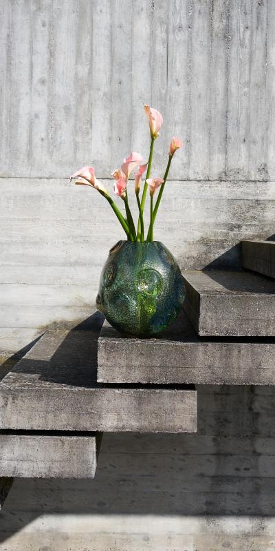 Lithos reimagines glass as a dense, stratified surface, transforming it into a compact, solid body crossed by inclusions and internal tensions — akin to a geological fragment. The collection offers a contemporary reinterpretation of Ercole Barovier’s pioneering research into the inclusion of materials within the molten glass mass. Inside the incandescent glass, a reactive mineral powder triggers a chemical transformation: bubbles and cavities form and remain trapped within the structure, coalescing into an irregular, profound skin. The glass thus acquires a stone-like character, evoking compressed and sedimented matter in which every variation becomes an integral part of the form and defines its identity. The surface emerges as a tactile landscape marked by craters and overlapping layers. Integrated optical lenses amplify the internal formations, revealing depth and visual complexity. Each piece is unique, shaped by the interplay of fire, chemical reaction, and precise control — striking a refined balance between material experimentation and formal clarity. In Lithos, matter itself becomes language.