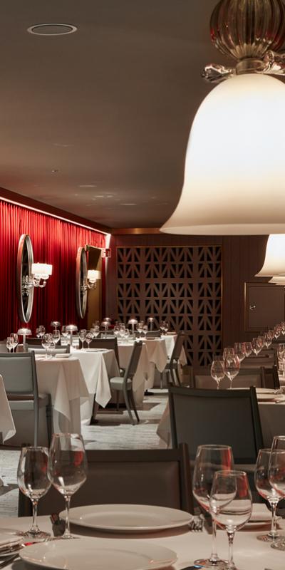 Developed by the studio of Marcel Wanders, the interior design is based on the historic opera house of Munich. The main colour of the entire restaurant is red, from the carpets to the sofas, and the soft fabric drapes in several of the rooms. Aesthetic and emotional impact go hand in hand, sustaining each other. It is a narrative that speaks of drama and surprise, formulating an intense atmosphere of great impact. The interior is also theatrical in terms of lighting, using mirrors in a brilliant way to multiply light and space in a game of infinite reflections. At the centre of the oval mirrors shine the lamps of the Tangeri collection, produced with traditional techniques reinterpreted to obtain greater simplicity and lightness. The Perseus suspension lamps are delicate and sophisticated, punctuating the central tables. This collection designed by Studio Marcel Wanders in 2015 brings out the expressive qualities of handcrafted blown Venetian Crystal with extreme grace and compositional balance.