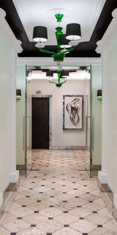 Organized on five levels now converted for use as offices, this building was first created as a hospitality structure. The façade in neoclassical style foreshadows the taste and character of the interiors, with features that have been carefully conserved in the renovation. Called in to redesign the entrance and the reception area, the studio Triform Factory has kept the stone floors, plaster columns and ceiling decorations. White, anthracite grey and green are the colours utilized to set the distinctive tone of the project. Elegant and minimal in its design, Saint Germain has been chosen for the entire space, in the chandelier version with three or five lights, and the applique model, for a rhythmical sequence alternating with the pilasters. The finishes in galvanized gold highlight the glow of the Venetian Crystal, in a vibrant shade of Antalya green. They also reference the finial, composed of a sphere expertly crafted with the dipped gold technique.