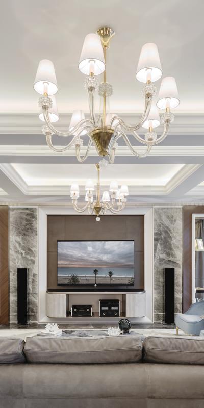 A luxurious flat in Nice, based on extensive research on materials: fine stone and marble for the floors, walls with mirrors, precious carpets and custom furnishings. All organized with neutral, relaxing tones, ranging from grey to beige, with accents of powder blue. For the living area, two twin customized Amsterdam chandeliers have been produced, in a size that adapts perfectly to the volume of the space.
