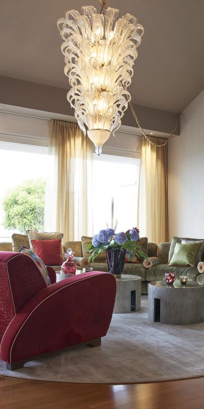 A project inspired by the Art Deco period, full of nuances, transitions and marked contrasts that create an extraordinary atmosphere in the living area, thanks to lush, luminous colours and deep dark tones. A harmonious combination of rigorous geometric and rounded forms, precious wooden furnishings with inserts of glass and metal. The spectacular Piume suspension lamp with its seven levels is enhanced by a gold finish that goes perfectly with the floral ornaments and animalier subjects.