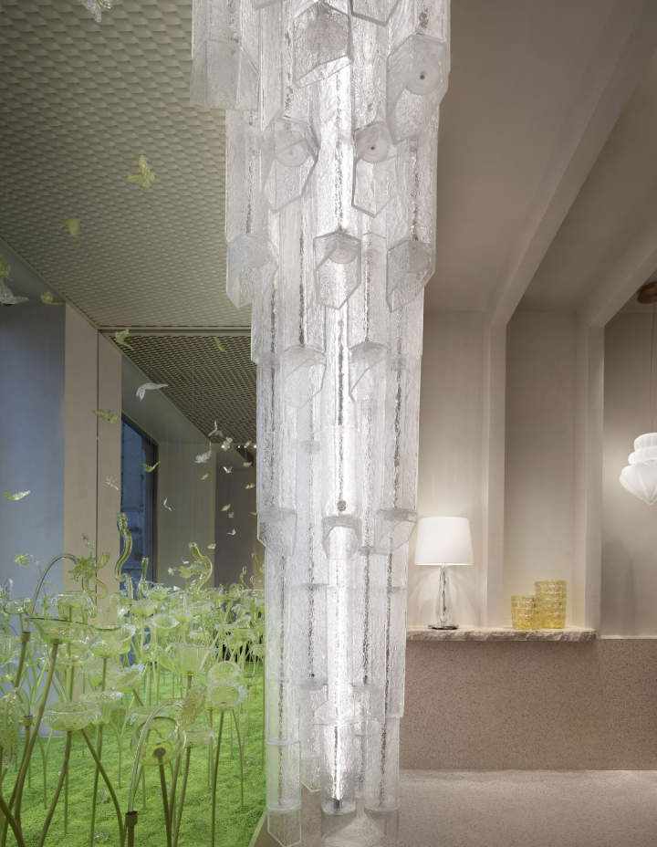 Just a few months after the opening of the monobrand boutique in Calle Larga XXII Marzo in Venice, Barovier&Toso presents a new setting by inviting Nichetto Studio to envision a completely different scenario from the initial one. If the “Flora&Flutter” installation, introduced in June 2023, was characterized by a garden of lush plants in intense liquid cedar-colored Venetian crystal, today it is ignited with bright orange, suggesting the theme of fire.