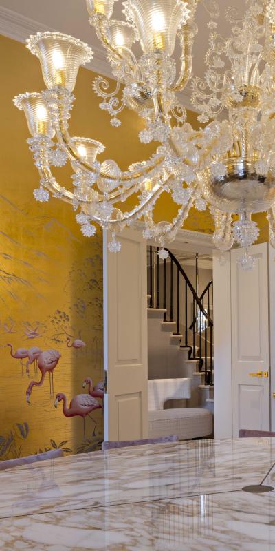 In uno dei quartieri più raffinati di Londra, questo appartamento prende forma all’interno di una storica residenza georgiana. Il progetto, firmato da Alessandra Home Interiors, nasce da un attento restauro che reinterpreta lo stile originale con sensibilità. contemporanea. Materiali pregiati, una palette equilibrata e arredi su misura creano un’atmosfera accogliente e sofisticata. I pavimenti in rovere con inserti in ottone dialogano armoniosamente con i marmi Arabescato e Fior di Bosco, mentre le carte da parati dipinte a mano animano gli interni con paesaggi sognanti e delicate scene naturali. La luce gioca un ruolo centrale, amplificata da superfici specchiate e dettagli metallici. In questo contesto si inseriscono perfettamente le creazioni di Barovier&Toso, che arricchiscono gli ambienti con equilibrio tra funzione e decoro. I lampadari Venezia 1295, in cristallo veneziano, con la loro trasparenza e leggerezza, diventano punti focali che collegano visivamente le diverse aree senza mai sovrastarle. Anche nel bagno padronale, essenziale e raffinato, la presenza del Venezia 1295 contribuisce a definire l’identità del progetto, fondato su un sofisticato dialogo tra texture, riflessi e atmosfere luminose.