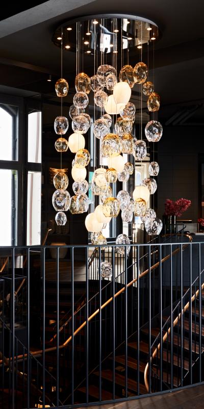 È il primo showroom di Slettvoll a varcare la penisola scandinava. La storica azienda norvegese di mobili, nata nel 1951, ha scelto questo elegante palazzo del ‘900 per ambientare le sue collezioni per la casa, il cottage ed il giardino. Dopo una bella scalinata a ventaglio, si viene accolti da un ampio ingresso, illuminato dal lampadario Nevada, in cristallo veneziano rosa, delicato e sofisticato, con i suoi bracci rettilinei ed i suoi esili pendagli a forma di goccia. Più imponente, scenograficamente, è la sospensione Hanami, collocata al centro della doppia scala che conduce al piano inferiore dello showroom. La verticalità e l’unicità di ogni singola bolla soffiata realizzano una cascata di luce e oro.