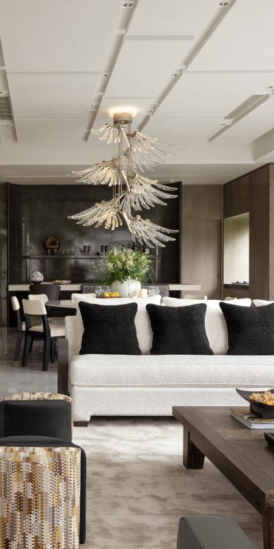 В сверкающем сердце Нового города Цяньцзян, Qianchao Mingcui возвышается, словно резиденция среди облаков, – двухуровневый пентхаус, задуманный как возвышенное убежище, где искусство, природа и уединение обретают тихий баланс. При входе открывается череда комнат, словно скрытый сад, постепенно раскрывающийся в атмосфере открытия. В центре, гостиная и столовая открытой планировки, становятся сердцем дома, предназначенным для встреч, размышлений и повседневной жизни. Над обеденным столом подвесной светильник Angel от Barovier&Toso представляет собой светящийся вертикальный жест. Его спираль из крыльев из венецианского хрусталя улавливает и преломляет свет, создавая живую и неземную атмосферу. На пороге бра Tuileries отмечает проход сдержанной элегантностью. Его четкая геометрия позволяет создавать гибкие композиции, задавая пространственный ритм даже при использовании отдельно. Здесь свет определяет пространство, направляет взгляд и создает ощущение безмолвного равновесия.