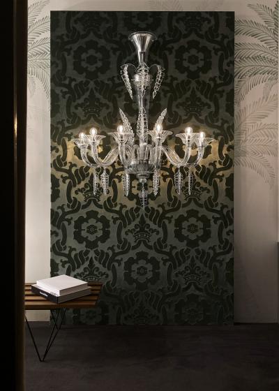 Основой всего проекта и изюминкой выставки является расположенная в коридоре инсталляция, созданная студией «Vandersandestudio». Она мастерски интерпретирует люстру «Trim», воспроизводя ее на потолке в длинной последовательности элементов. Эти геометрические формы из венецианского хрусталя чередуются настойчиво, в неправильном и изрезанном ритме, создавая настоящую трехмерную скульптуру, легкую, как мантия из драгоценного тюля, которая захватывает взгляд и воображение.